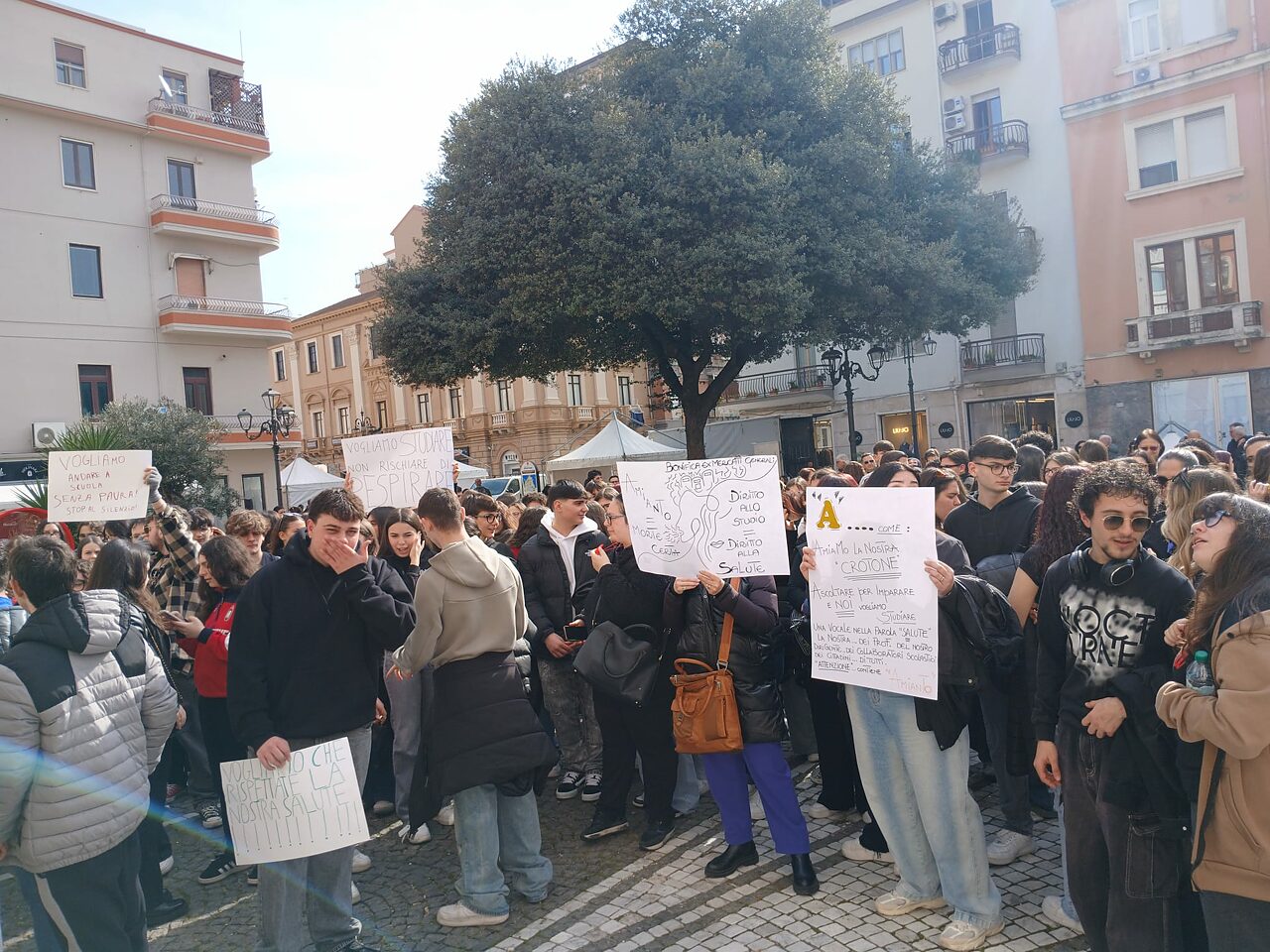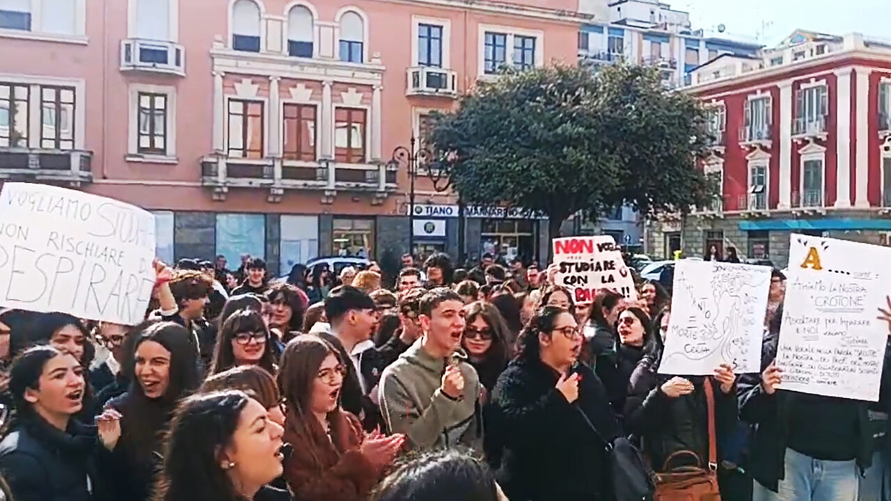 CROTONE Non hanno “steccato” il secondo appuntamento con la protesta per smuovere le acque sul loro diritto alla salute che viene prima di quello allo studio. Genitori e studenti del Liceo “Gravina” di Crotone si sono così ritrovati in piazza della Resistenza, questa mattina, tutti raccolti davanti al palazzo comunale con cartelli scritti a mano, riportanti parole semplici e dirette «come uno schiaffo alla distrazione», sottolineano gli organizzatori.