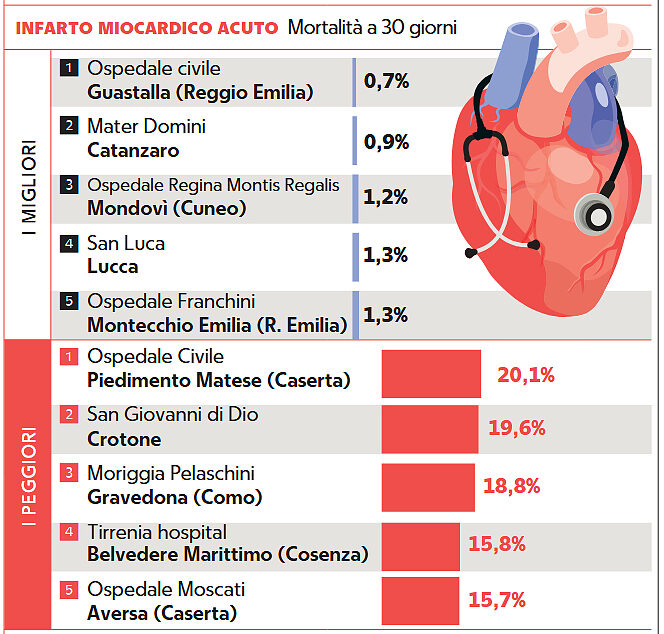 È quanto cristallizzato nel Piano nazionale esiti presentato da Agenas: la probabilità di mortalità a 30 giorni dall’infarto miocardico acuto è la seconda in Italia