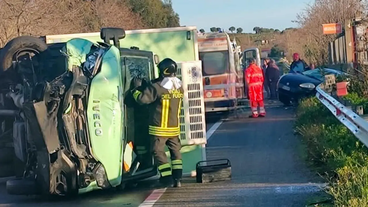 CIRÒ MARINA Un'incidente stradale è avvenuto questa mattina sulla Strada statale 106 nei pressi di Cirò Marina con uno scontro tra un'utilitaria e un furgone che si è ribaltato sulla carreggiata.