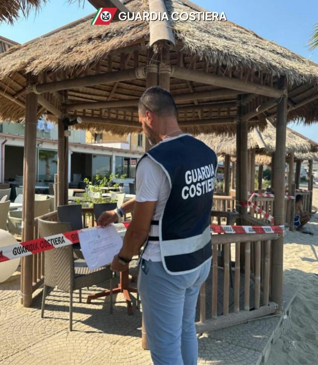 In un primo ristorante e' stata accertata un'occupazione abusiva di circa 700 metri quadrati di demanio, con un manufatto in legno adibito a pizzeria, un'ampia area pavimentata con chioschi e gazebo, oltre a ombrelloni e sdraio. Le strutture fisse sono state poste sotto sequestro, mentre l'area destinata a ombrelloni e sdraio e' stata liberata nell'immediato e restituita alla fruizione pubblica.