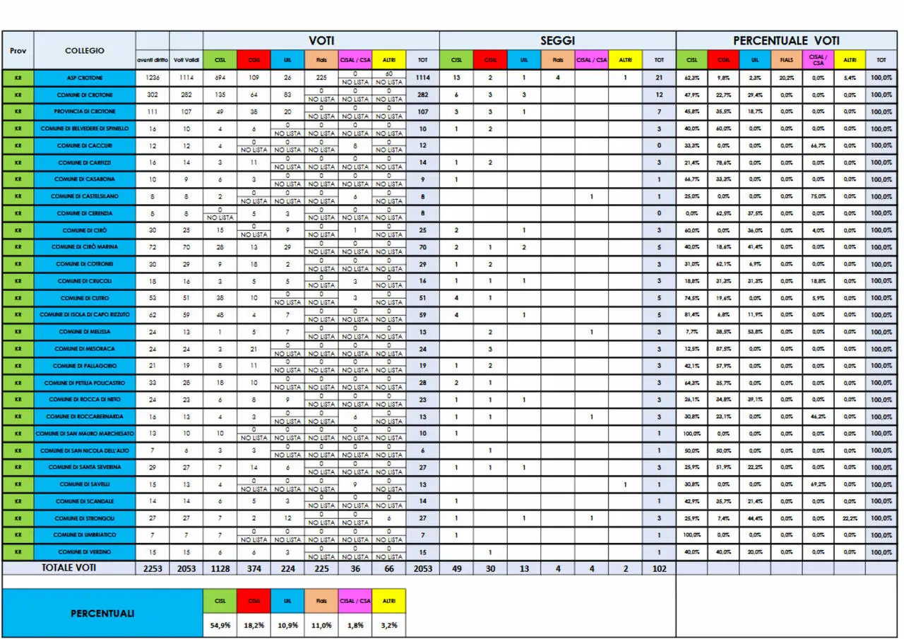 Il sindacato ha conquistato la metà dei consensi e dei seggi. Tutti i dati tra Azienda sanitaria provinciale, Provincia di Crotone e i suoi 27 Comuni