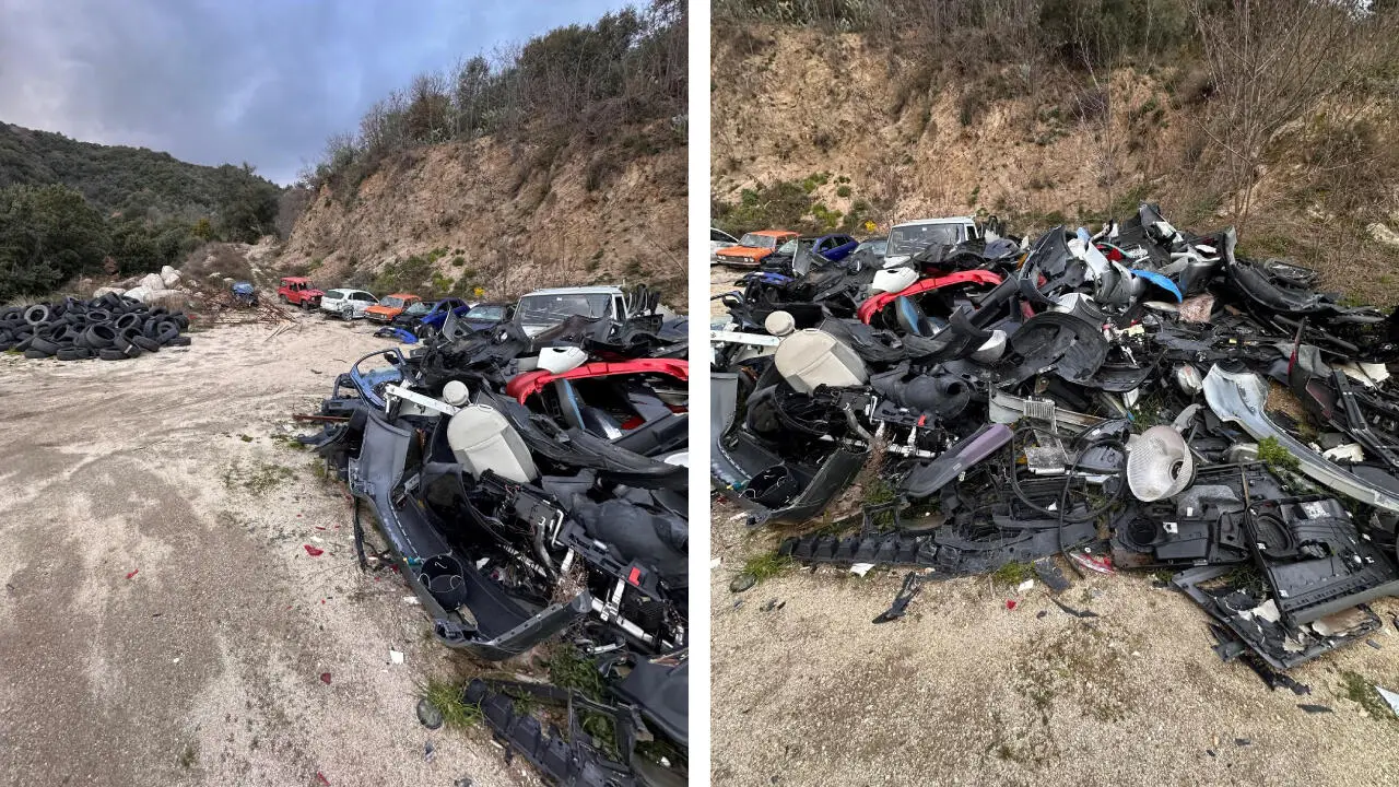 Il sopralluogo ha infatti rivelato la presenza di diversi materiali accumulati in modo irregolare su un terreno adiacente all'officina. Tra questi: veicoli fuori uso in attesa di riparazione; parti di ricambio provenienti da auto dismesse; paraurti e sportelli accatastati; materiale ferroso disperso; pneumatici di varie dimensioni; e cumuli di macerie e materiali inerti.