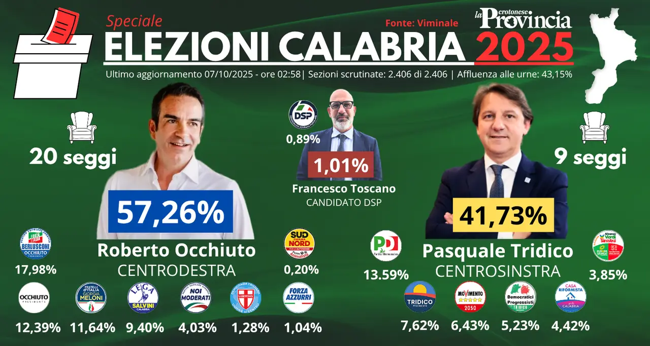 CROTONE All'esito finale delle elezioni regionali in Calabria, la ripartizione dei seggi del nuovo Consiglio assegna alla coalizione vincente di centrodestra 20 consiglieri, mentre al centrosinistra 9 consiglieri.